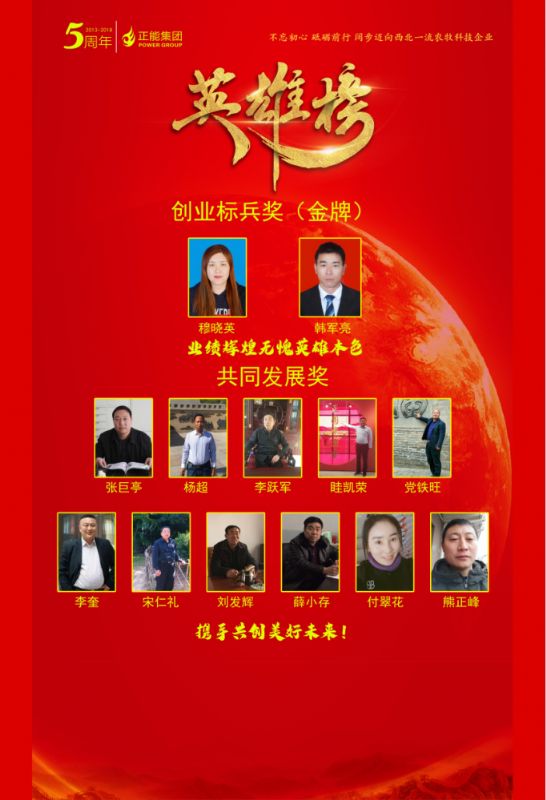 聯(lián)合發(fā)展獎(jiǎng)-優(yōu)秀供應(yīng)商 獎(jiǎng)牌木托+水晶獎(jiǎng)杯 西安邦淇制油科技有限公司 益海嘉里興平食品工業(yè)有限公司 三原三森膨化飼料有限公司 陜西寧興泰商貿(mào)有限公司 西安裕豐牧業(yè)有限責(zé)任公司 創(chuàng)業(yè)標(biāo)兵獎(jiǎng) 16 銀牌 8 咸興武養(yǎng)殖服務(wù)公司 陳樂樂 漢中養(yǎng)殖服務(wù)公司 徐衛(wèi)霖 渭北養(yǎng)殖服務(wù)公司 雷川文 濟(jì)源養(yǎng)殖服務(wù)公司 楊文軍 稷山養(yǎng)殖服務(wù)公司 劉保虎 隴東事業(yè)部 何三娃 山東事業(yè)部 蔣 成 秦東事業(yè)部 蘇善輝 創(chuàng)業(yè)標(biāo)兵獎(jiǎng) 8 養(yǎng)豬事業(yè)部 合同豬放養(yǎng)部技術(shù)經(jīng)理 楊春龍 養(yǎng)豬事業(yè)部 九龍?jiān)簇i場廠長 任林沖 高陵基地品管部經(jīng)理 惠星濤 高陵基地生產(chǎn)部經(jīng)理 雷永軍 高陵基地采購部經(jīng)理 史芝平 高陵基地財(cái)務(wù)部經(jīng)理 王 敏 新絳生產(chǎn)基地 銷管 李玉蓮 高陵基地 銷售主管 鬲心疼 創(chuàng)業(yè)標(biāo)兵獎(jiǎng)(金牌) 養(yǎng)豬事業(yè)部 供銷部總監(jiān) 韓軍亮老師 武威生產(chǎn)基地 銷 管 穆曉英老師 創(chuàng)業(yè)英雄獎(jiǎng)(10人) 銀牌 榮獲正能集團(tuán)五周年 “創(chuàng)業(yè)英雄獎(jiǎng)”的創(chuàng)業(yè)英雄干部共10人 隴東事業(yè)部 總經(jīng)理 李 勇 陜南事業(yè)部 總經(jīng)理 董 雄 河西事業(yè)部 總經(jīng)理 蔡祖寬 河?xùn)|事業(yè)部 總經(jīng)理 陳小華 秦西事業(yè)部大客戶部 總經(jīng)理 張博社 秦西事業(yè)部禮乾養(yǎng)殖服務(wù)公司 總經(jīng)理 翟轉(zhuǎn)鎖 新豐泰事業(yè)部新甘隴 總經(jīng)理 田 琦 晉北事業(yè)部晉中養(yǎng)殖服務(wù)公司 總經(jīng)理 吳慶東 晉南事業(yè)部運(yùn)城養(yǎng)殖服務(wù)公司 總經(jīng)理 周彥軍 陜北事業(yè)部大客戶部 總經(jīng)理 何國華 創(chuàng)業(yè)功勛獎(jiǎng) (3人) 銀牌 集團(tuán)副總裁、秦西事業(yè)部總經(jīng)理 屠茂堂老師 養(yǎng)豬產(chǎn)業(yè)總裁 李高峰老師 集團(tuán)副總裁、產(chǎn)品技術(shù)研發(fā)總監(jiān) 連星老師